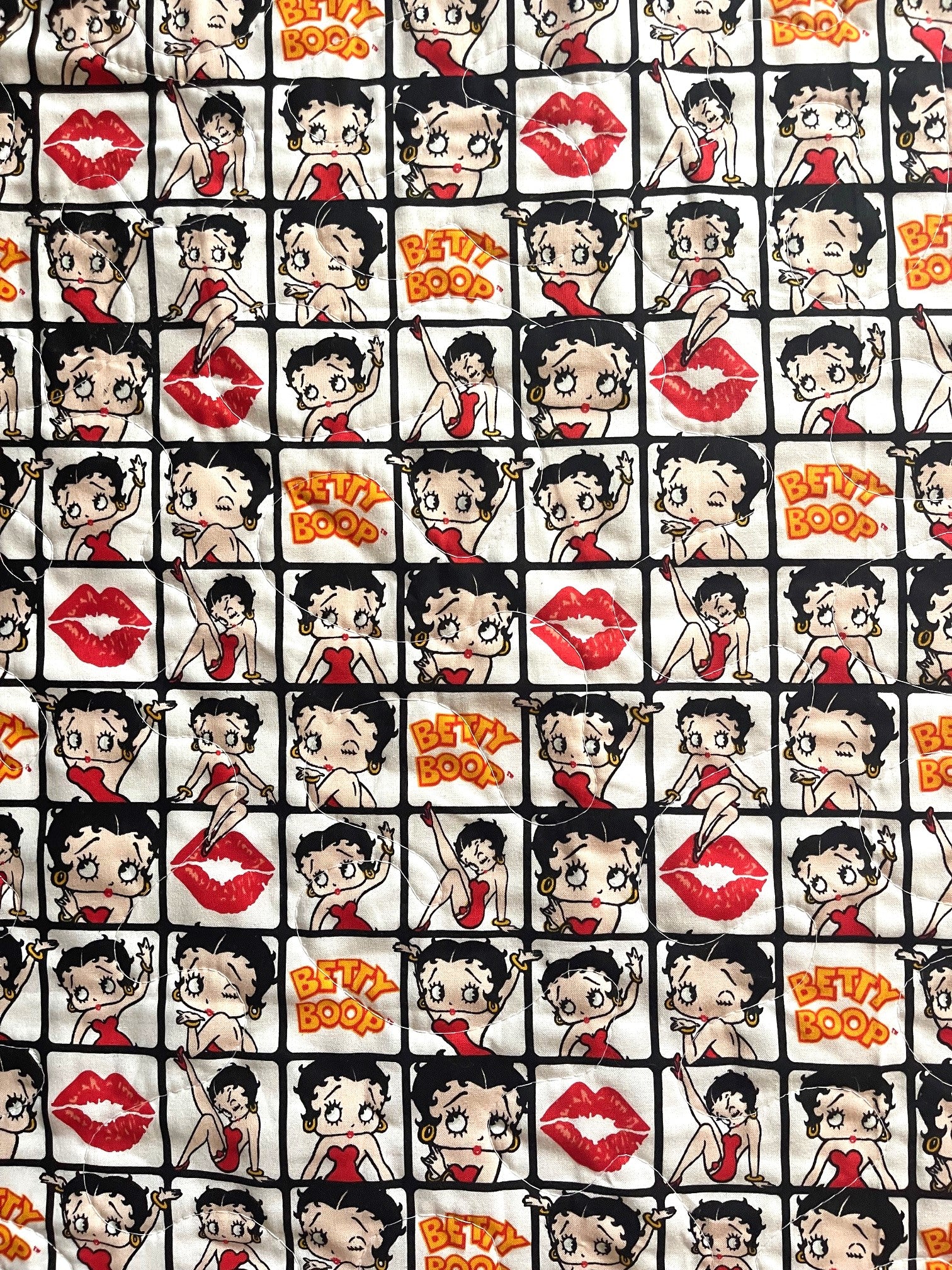 This handmade gender neutral 100% Cotton light weight quilted blanket includes 3 layers: Top layer is Betty Boop fabric. Centered with quality 100% cotton soft batting. Binding and backing are 100% cotton coordinating fabric with wavy topstitching and mitered corners for a sharp appearance. Stippling Quilted Hand Guided (using Machine) Stippling Quilted for that quilted look when washed.