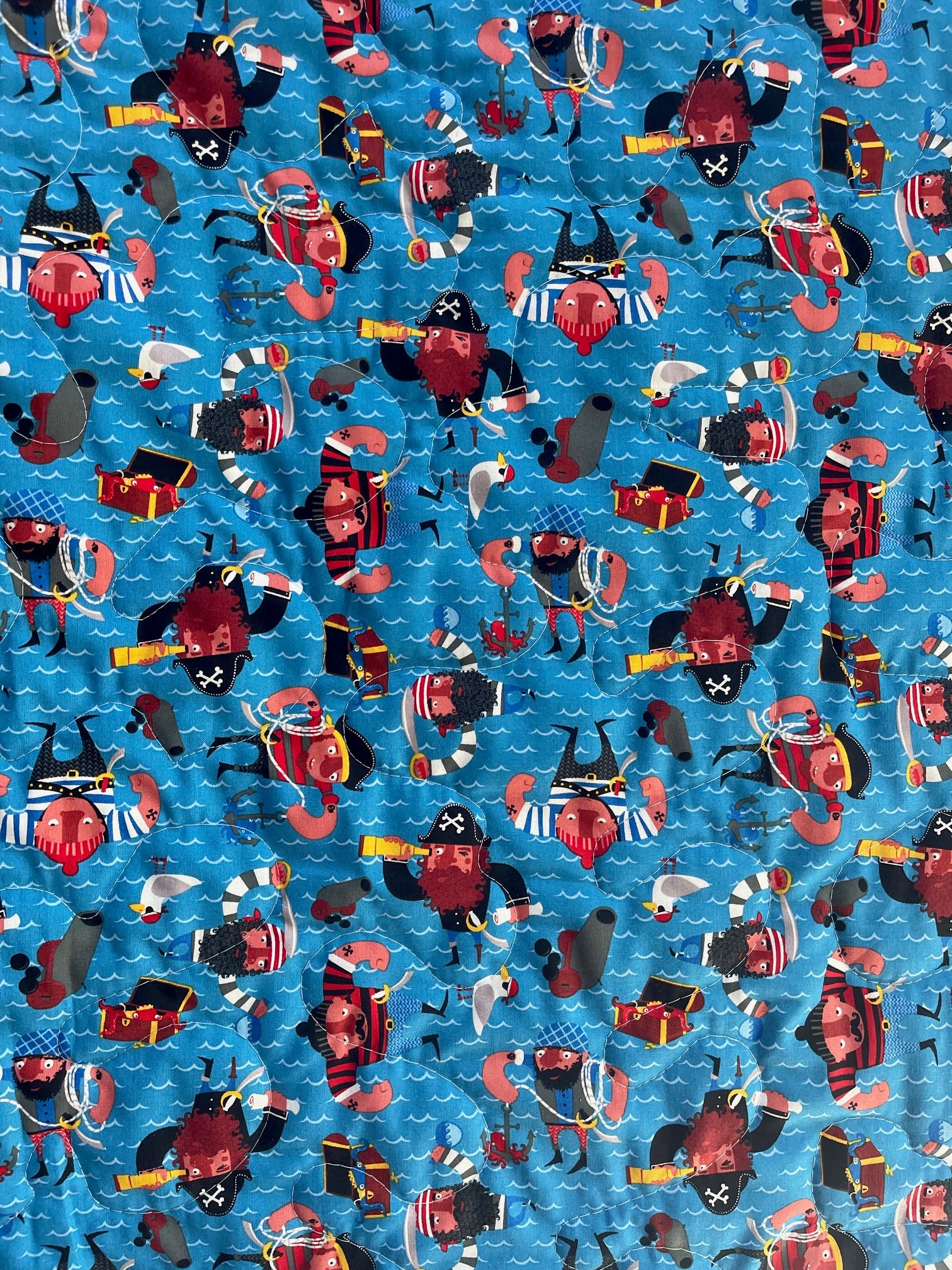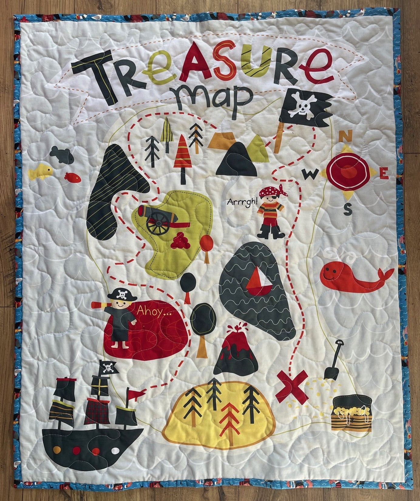 Handmade 100% Cotton quilted blanket includes 3 layers: Top layer is PIRATE TREASURE MAP quilt panel. Centered with quality 100% cotton soft batting. Binding and backing are 100% cotton coordinating fabric with wavy topstitching and mitered corners for a sharp appearance. Stippling Quilted Hand Guided (using Machine) Stippling Quilted for that quilted look when washed.