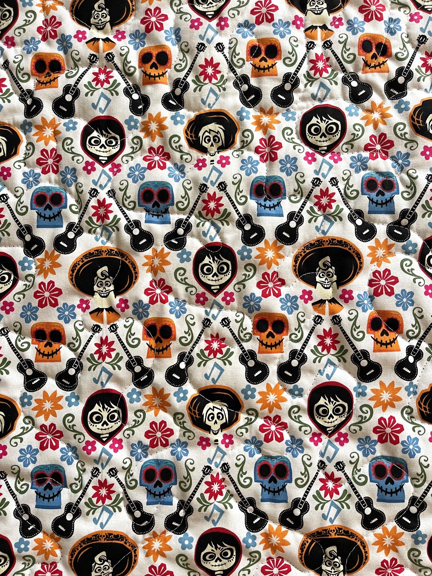 Handmade 100% Cotton lightweight quilted blanket includes 3 layers: Top layer is COCO fabric. Centered with quality 100% cotton soft batting. Binding and backing are 100% cotton black fabric with wavy topstitching and mitered corners for a sharp appearance. Stippling Quilted Hand Guided (using Machine) Stippling Quilted for that quilted look when washed.
