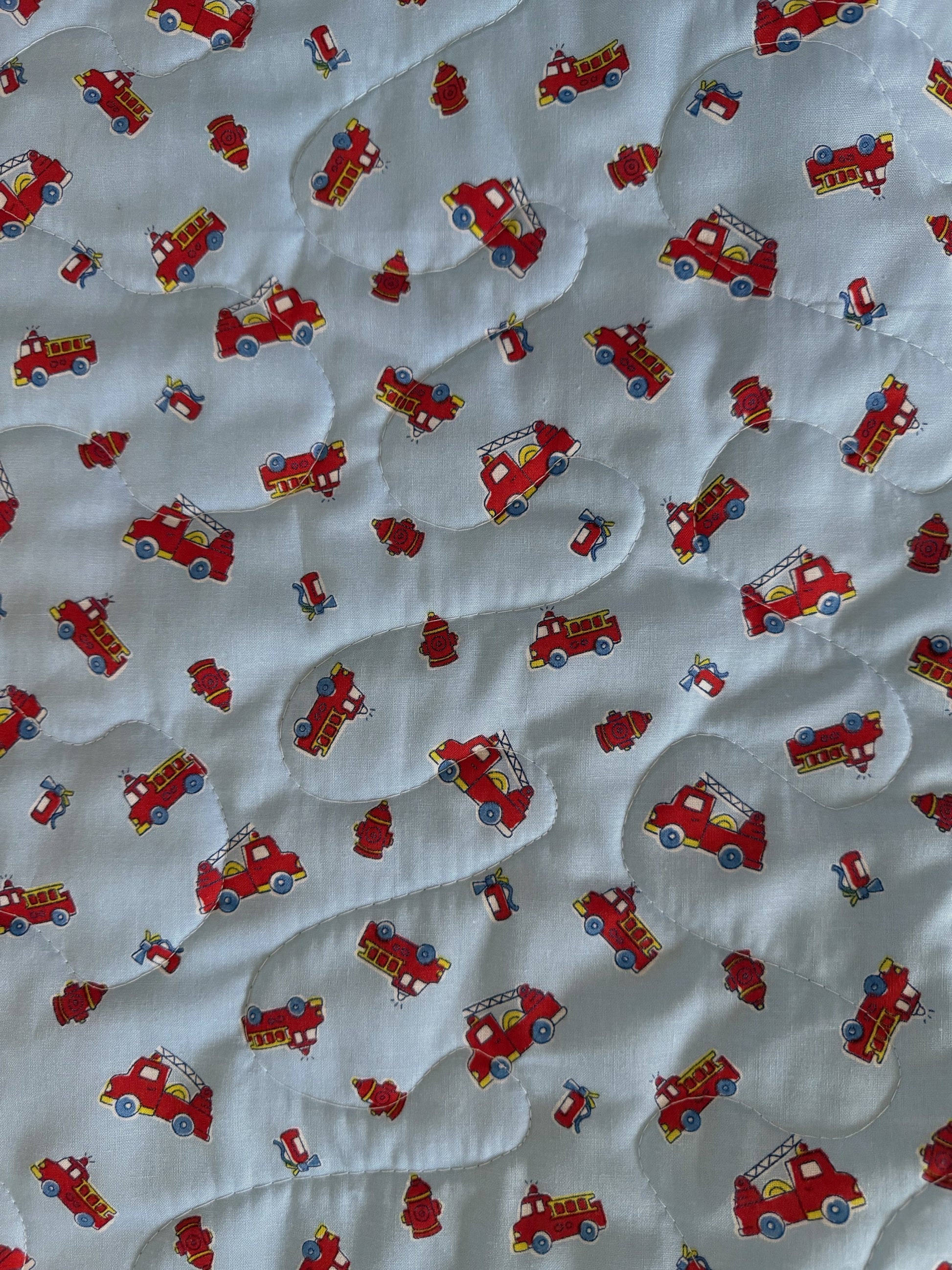 This gender neutral 100% Cotton light weight quilted blanket includes 3 layers: Top layer is Fireman Fire Rescues quilt panel. Centered with quality 100% cotton soft batting. Binding and backing are 100% cotton coordinating fabric with wavy topstitching and mitered corners for a sharp appearance. Stippling Quilted Hand Guided (using Machine) Stippling Quilted for that quilted look when washed.