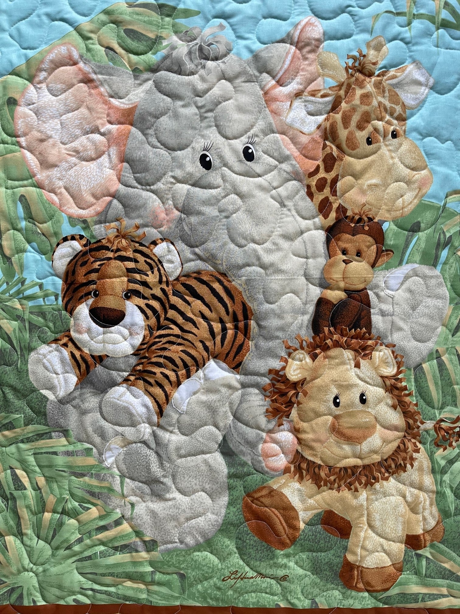 This gender neutral 100% Cotton light weight quilted blanket includes 3 layers: Top layer is Jungle Babies quilt panel. Centered with quality 100% cotton soft batting. Binding and backing are100% cotton coordinating fabric with wavy topstitching and mitered corners for a sharp appearance. Stippling Quilted Hand Guided (using Machine) Stippling Quilted for that quilted look when washed.