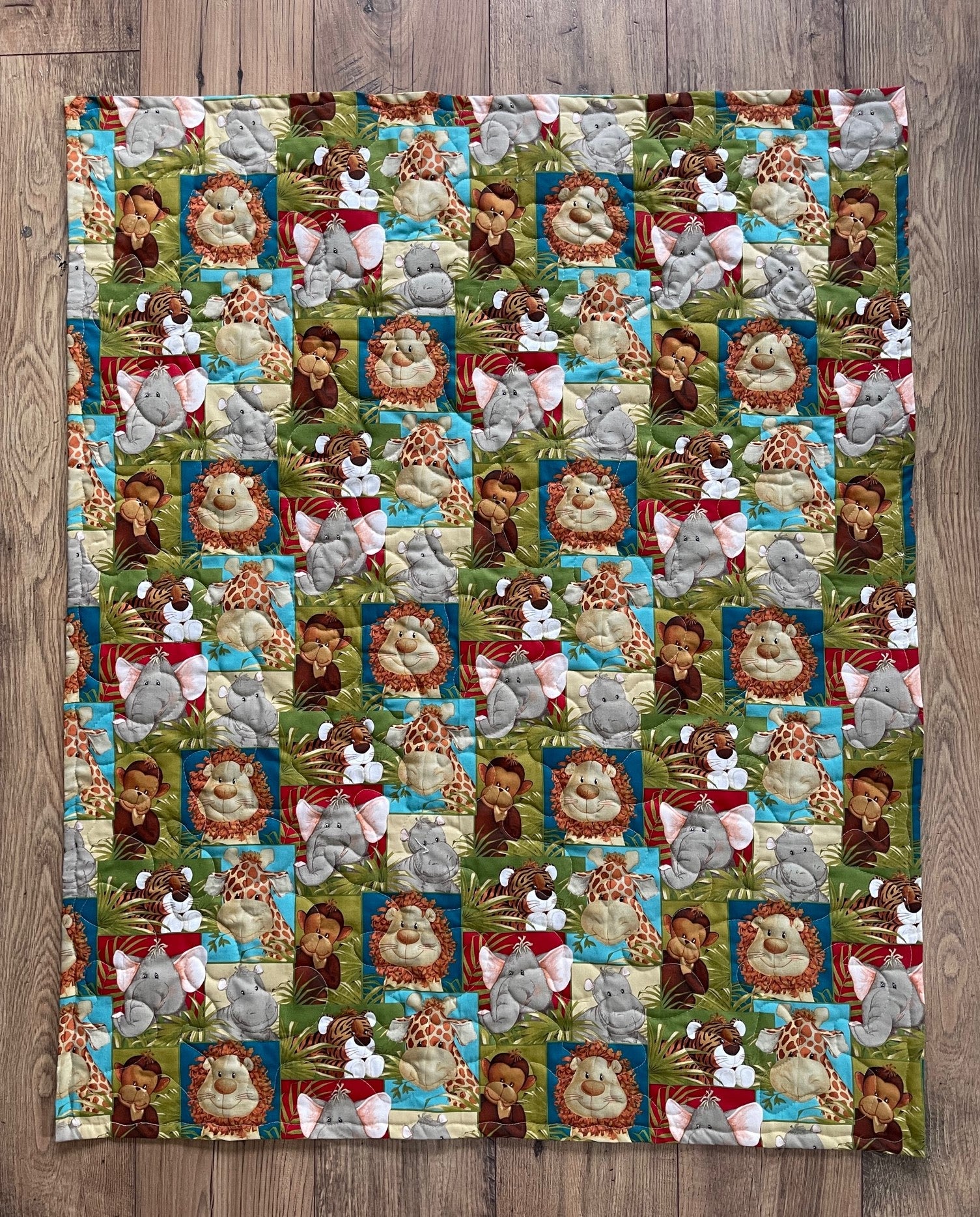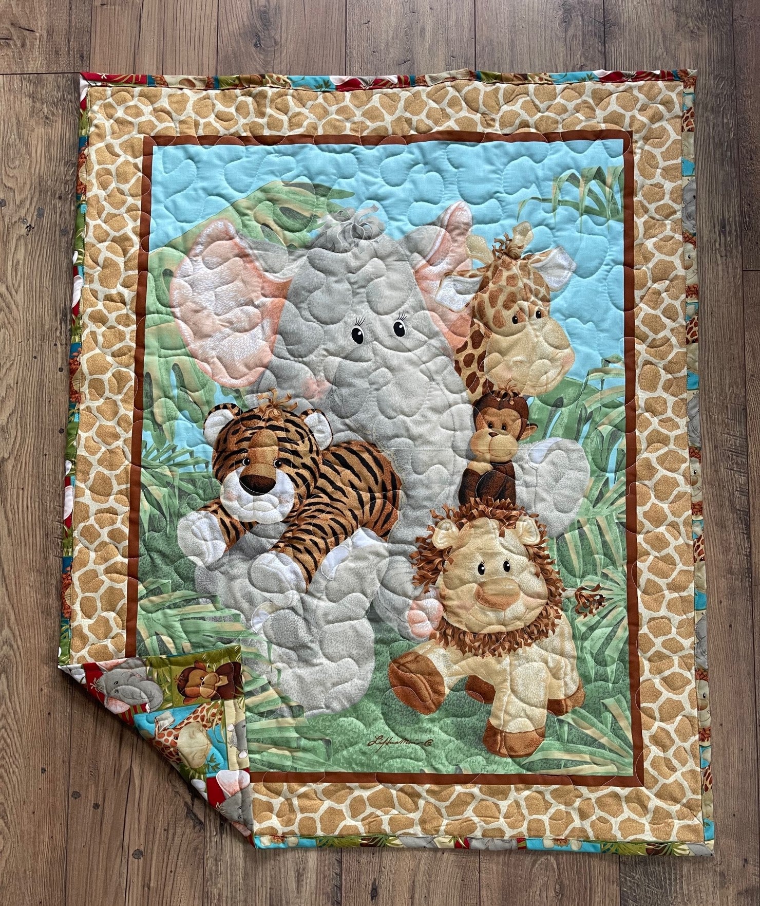 JUNGLE BABY ANIMALS ELEPHANT, LION, GIRAFFE, MONEY & TIGER Handmade Quilted Blanket