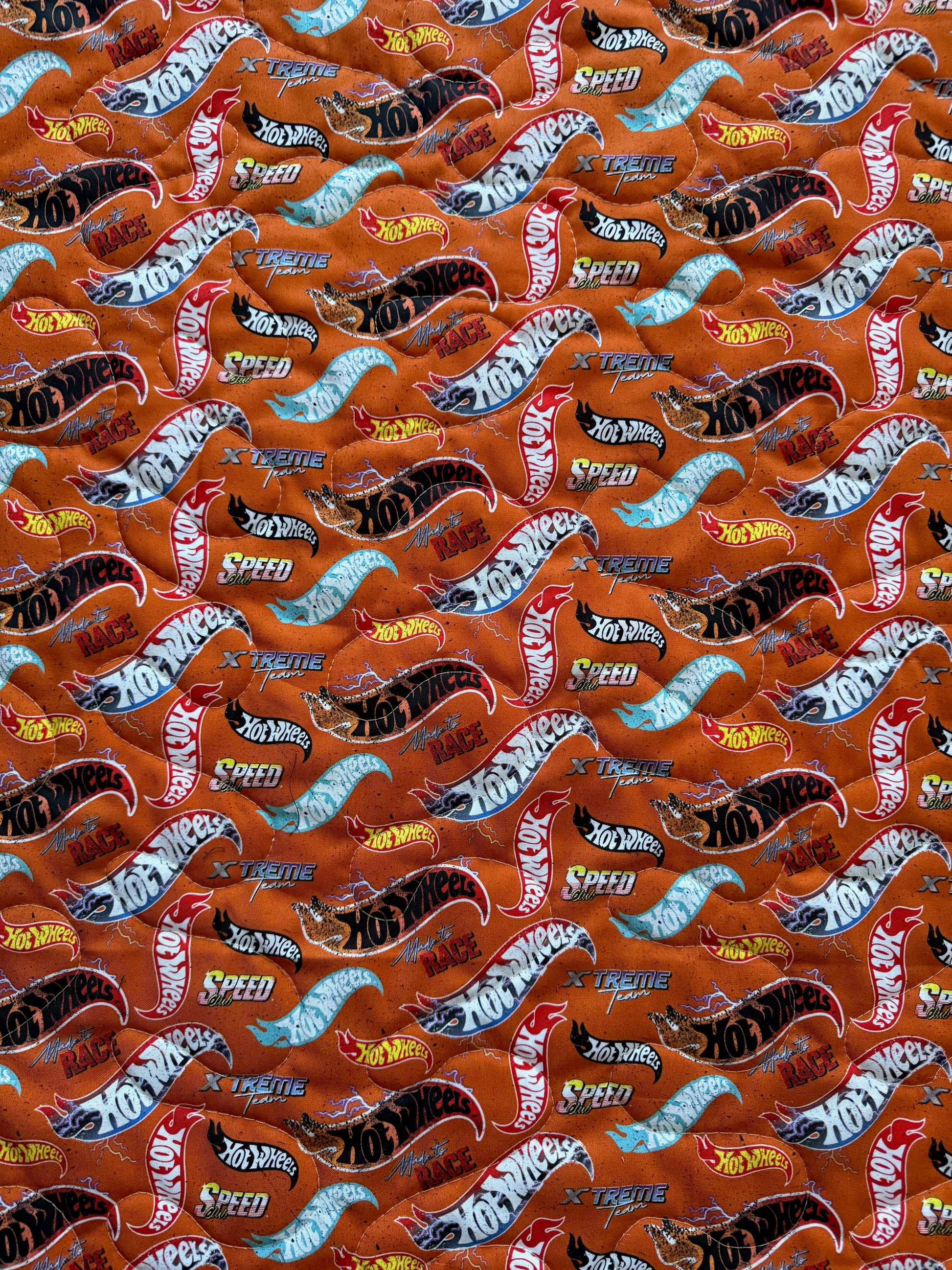Handmade 100% Cotton light weight quilted blanket includes 3 layers: Top layer is Hot Wheel inspired quilt panel. Centered with quality 100% cotton soft batting. Binding and backing are 100% cotton coordinating fabric with wavy topstitching and mitered corners for a sharp appearance. Stippling Quilted Hand Guided (using Machine) Stippling Quilted for that quilted look when washed.