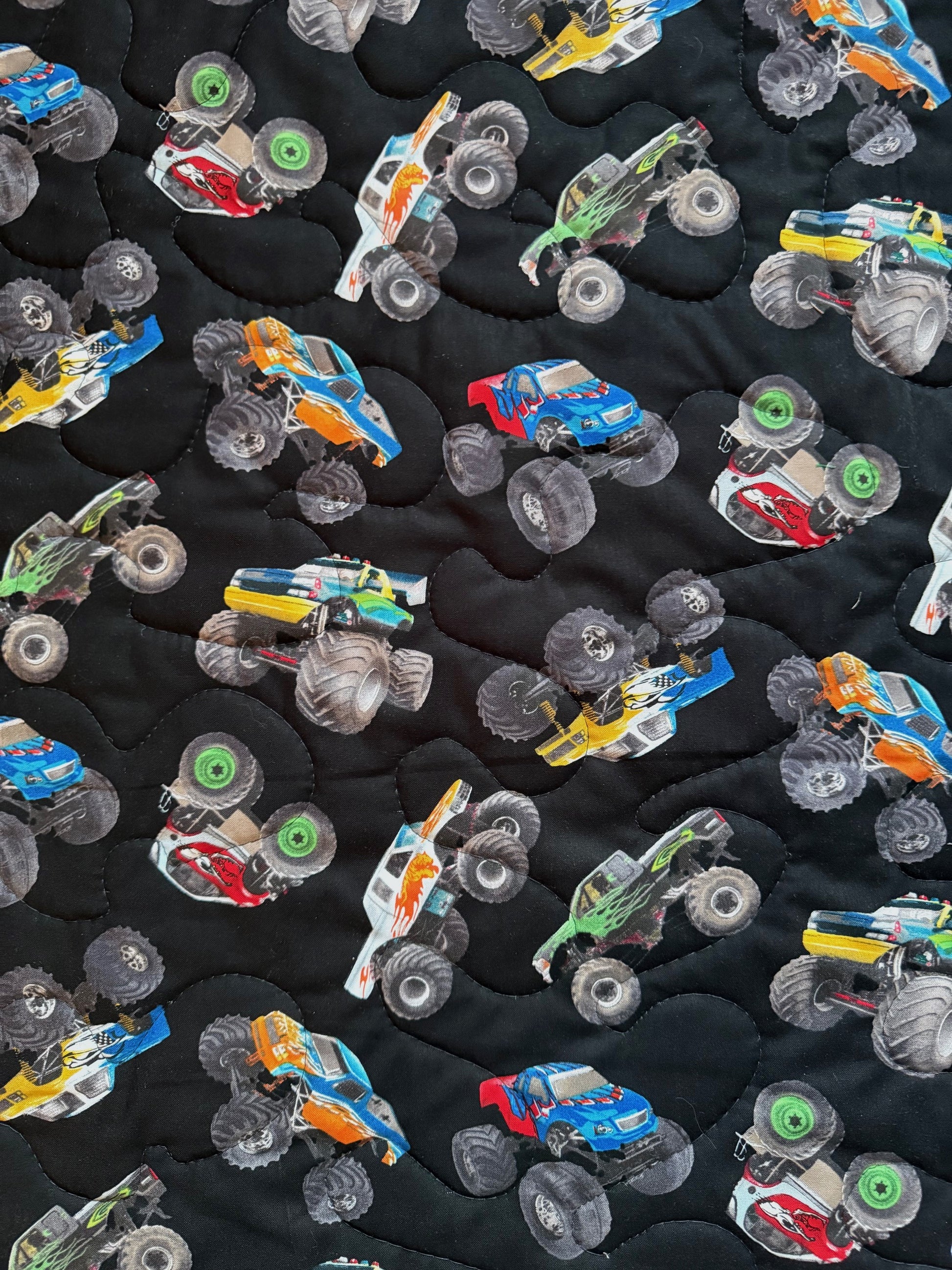 Handmade 100% Cotton light weight quilted blanket includes 3 layers: Top layer is Hot Wheel inspired quilt panel. Centered with quality 100% cotton soft batting. Binding and backing are 100% cotton coordinating fabric with wavy topstitching and mitered corners for a sharp appearance. Stippling Quilted Hand Guided (using Machine) Stippling Quilted for that quilted look when washed.