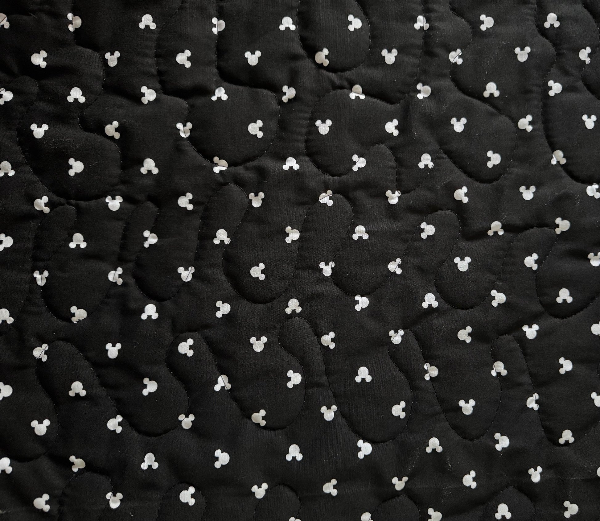 This handmade gender neutral 100% Cotton light weight quilted blanket includes 3 layers: Top layer is Mickey & Minnie Mouse inspired quilt panel. Centered with quality 100% cotton soft batting. Binding and backing are 100% cotton back with white Mickey Ears coordinating fabric with wavy topstitching and mitered corners for a sharp appearance. Stippling Quilted Hand Guided (using Machine) Stippling Quilted for that quilted look when washed.