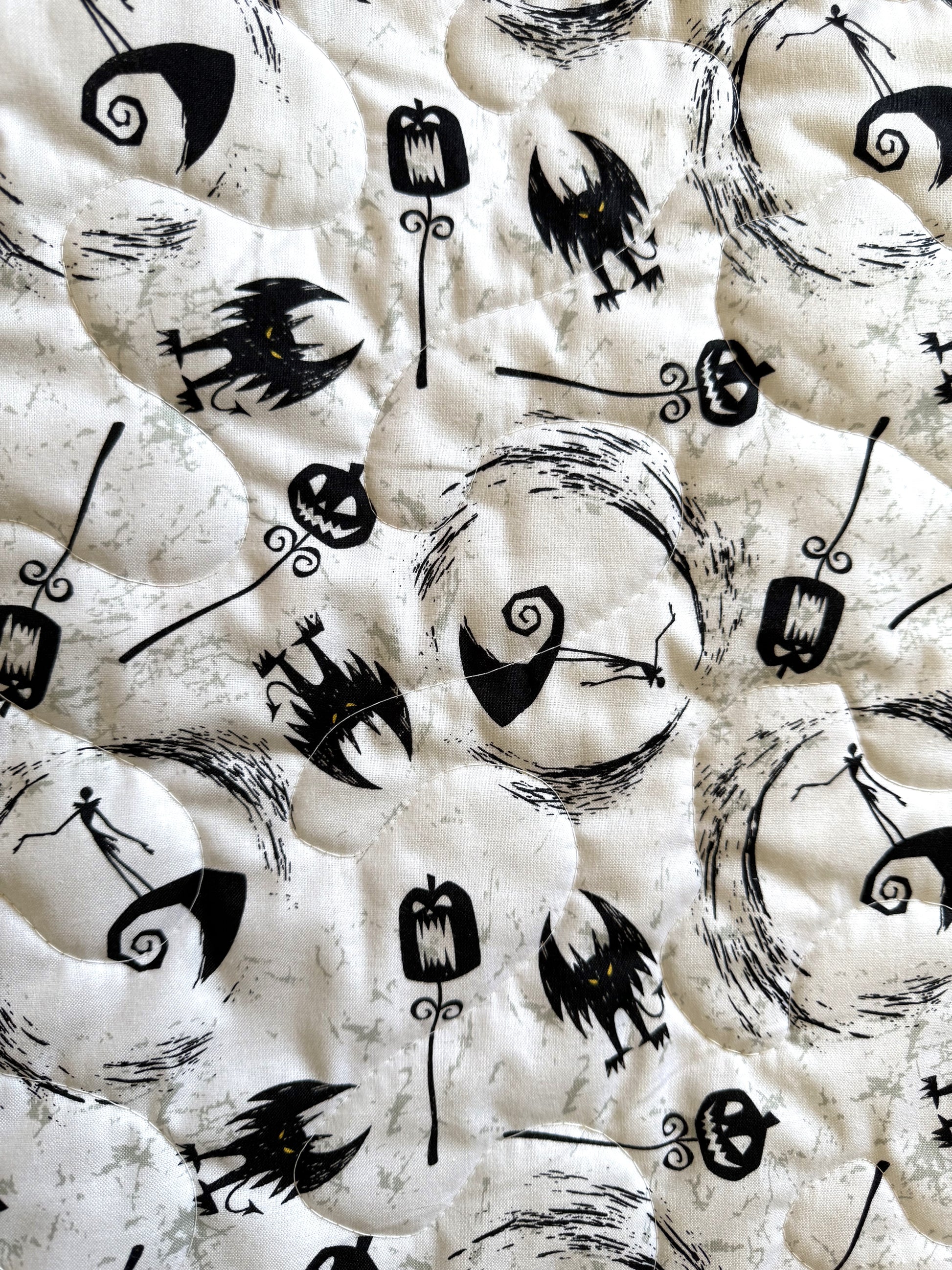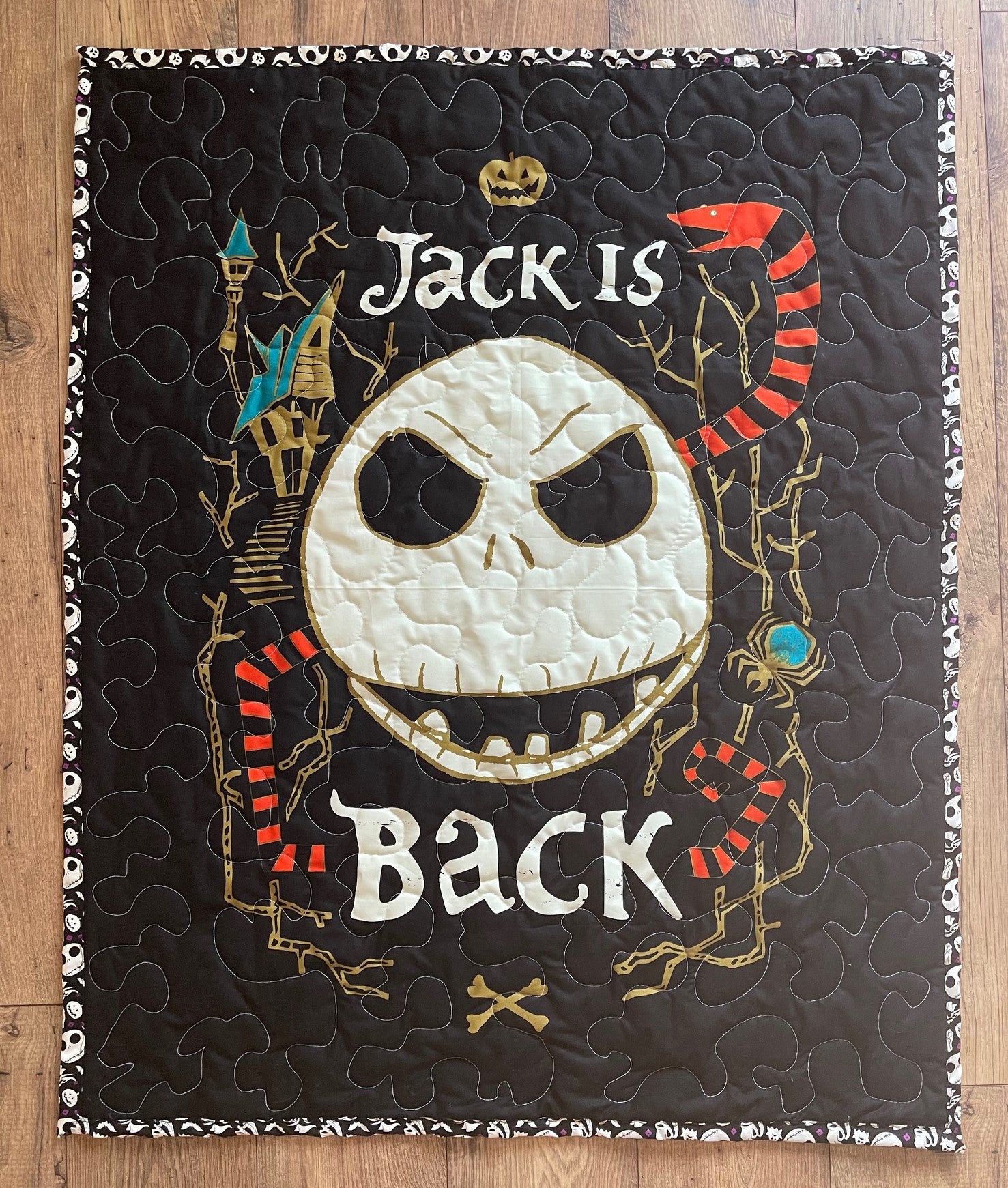 Handmade 100% Cotton light weight quilted blanket includes 3 layers: Top layer is Jack Skellington Glow In the Dark quilt panel and border fabric. Centered with quality 100% cotton soft batting. Binding and backing are 100% cotton coordinating fabric with wavy topstitching and mitered corners for a sharp appearance. Stippling Quilted Hand Guided (using Machine) Stippling Quilted for that quilted look when washed.