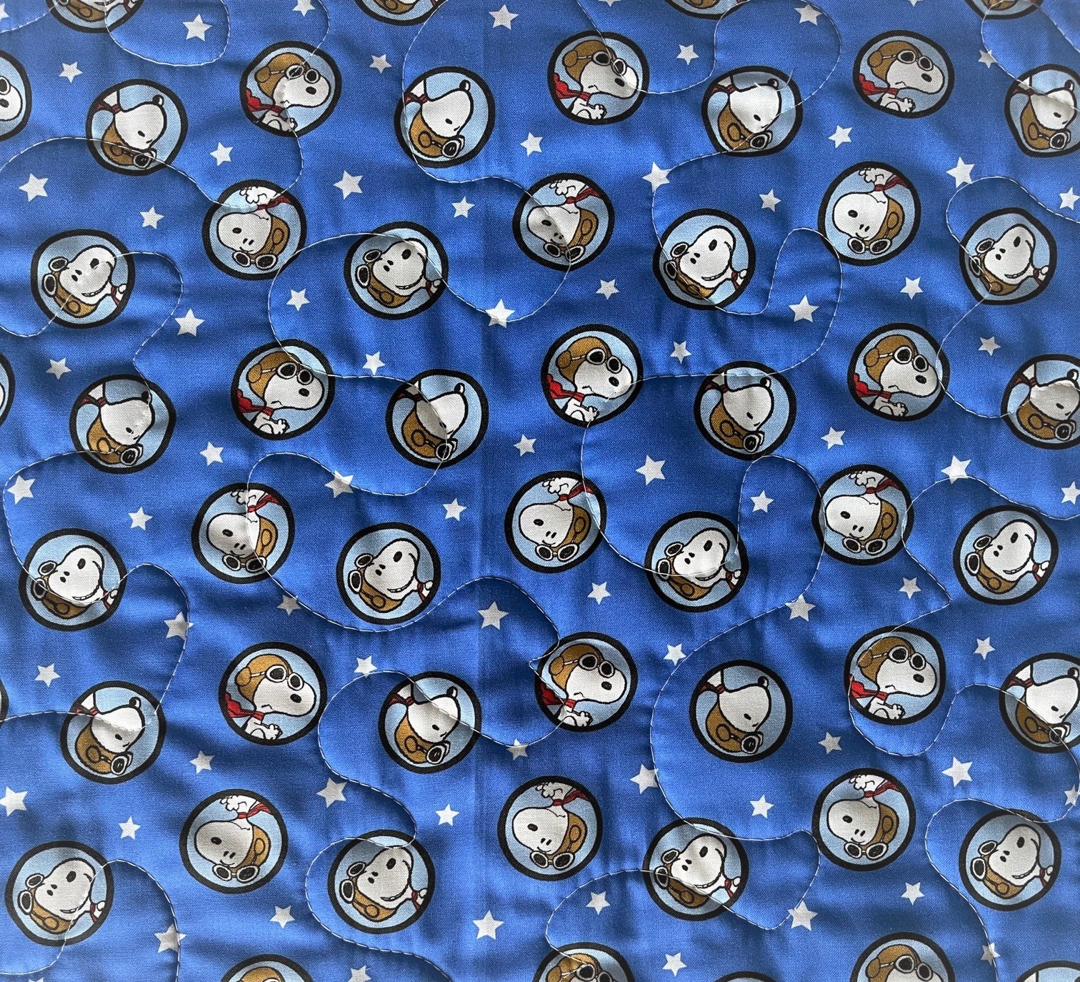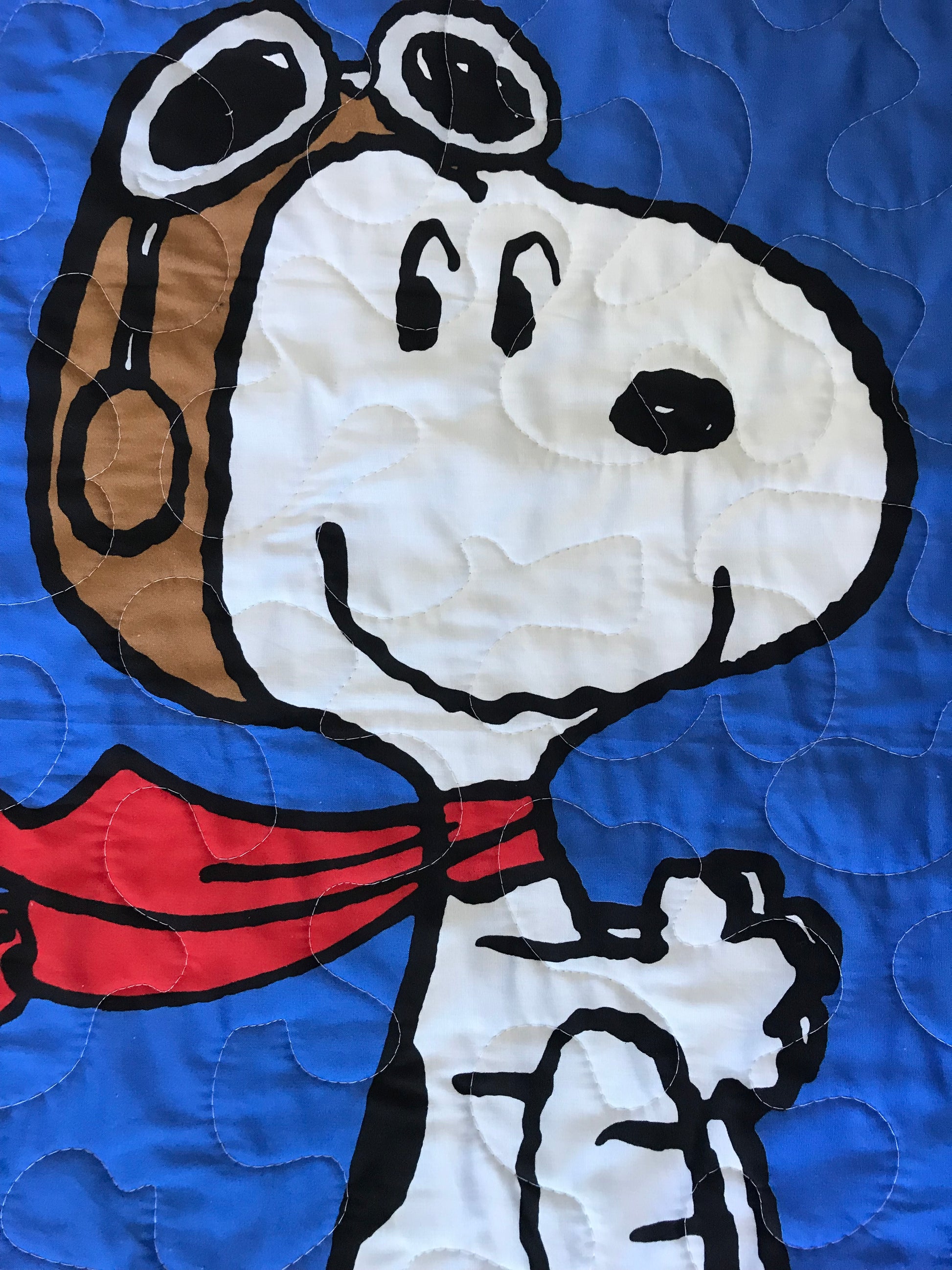 This gender neutral 100% Cotton light weight quilted blanket includes 3 layers: Top layer is Snoopy Flying Ace inspired quilt panel. Centered with quality 100% cotton soft batting. Binding and backing are 100% cotton coordinating fabric with wavy topstitching and mitered corners for a sharp appearance. Stippling Quilted Hand Guided (using Machine) Stippling Quilted for that quilted look when washed.