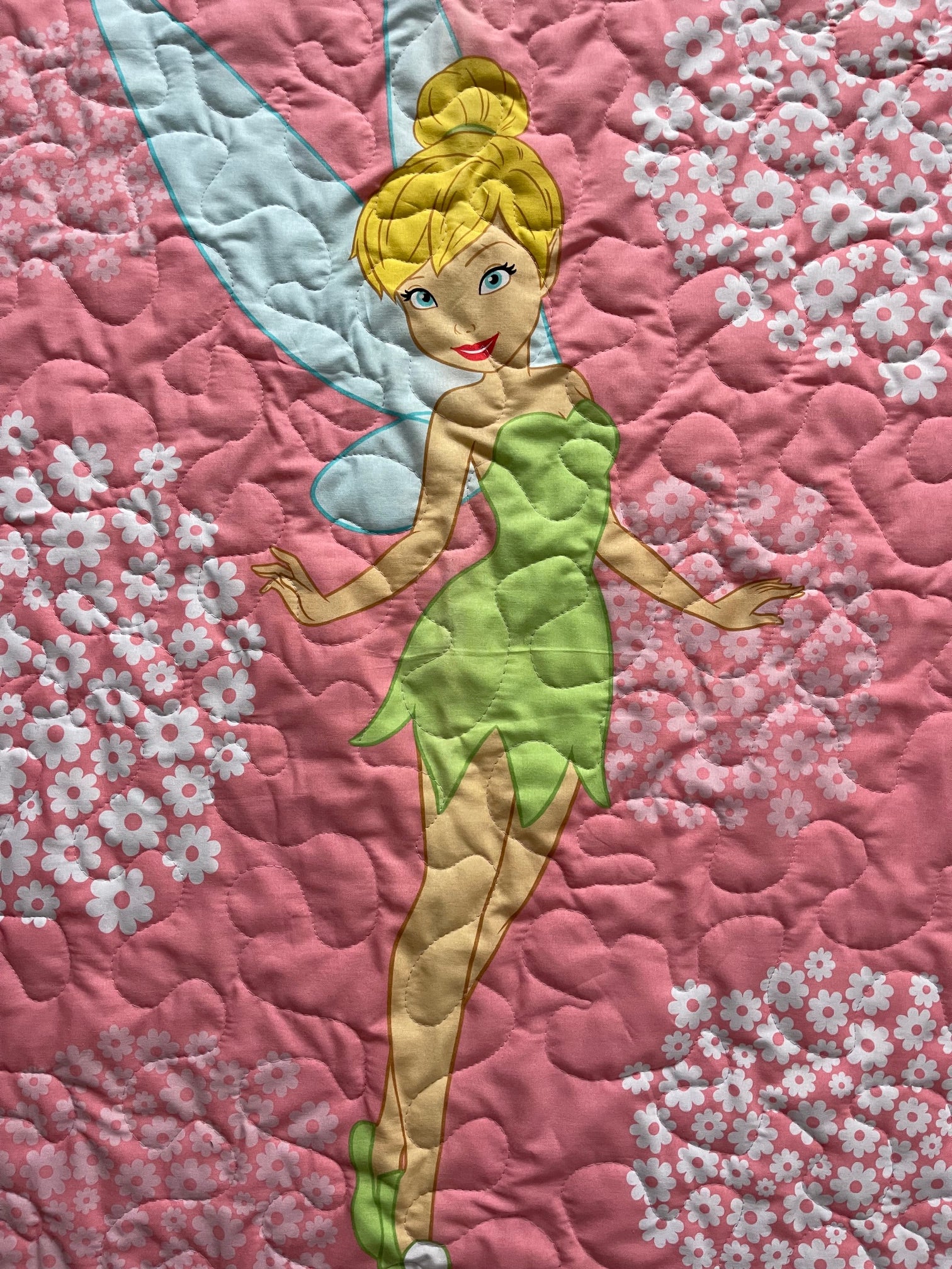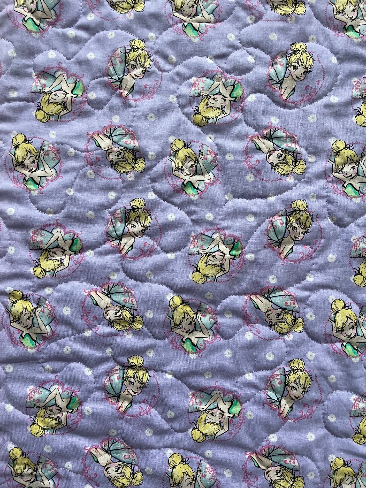 Handmade 100% Cotton light weight quilted blanket includes 3 layers: Top layer is Peter Pan's TINKER BELL inspired quilt panel. Centered with quality 100% cotton soft batting. Binding and backing are100% cotton coordinating fabric with mitered corners for a sharp appearance. Stippling Quilted Hand Guided (using Machine) Stippling Quilted for that quilted look when washed.