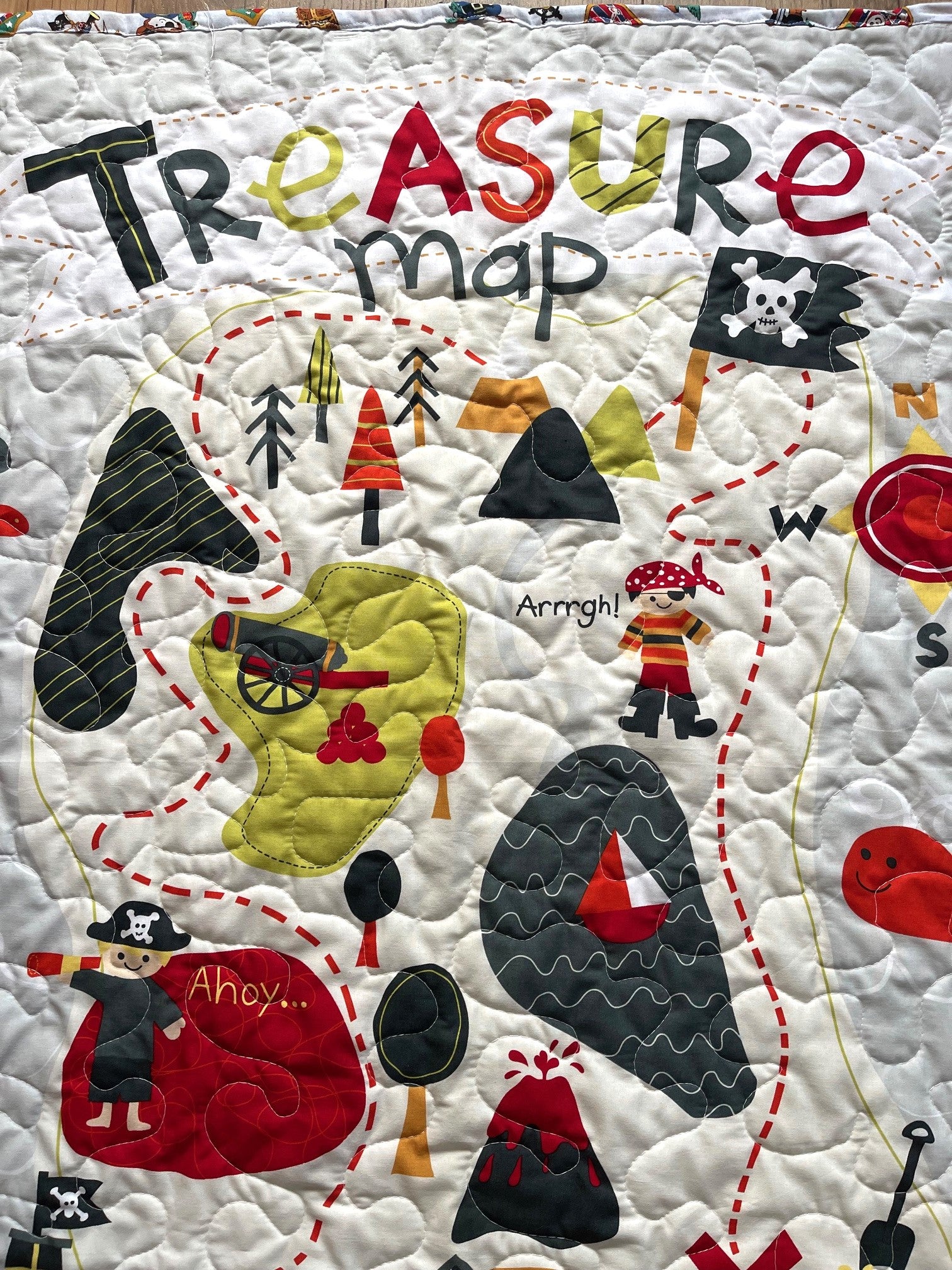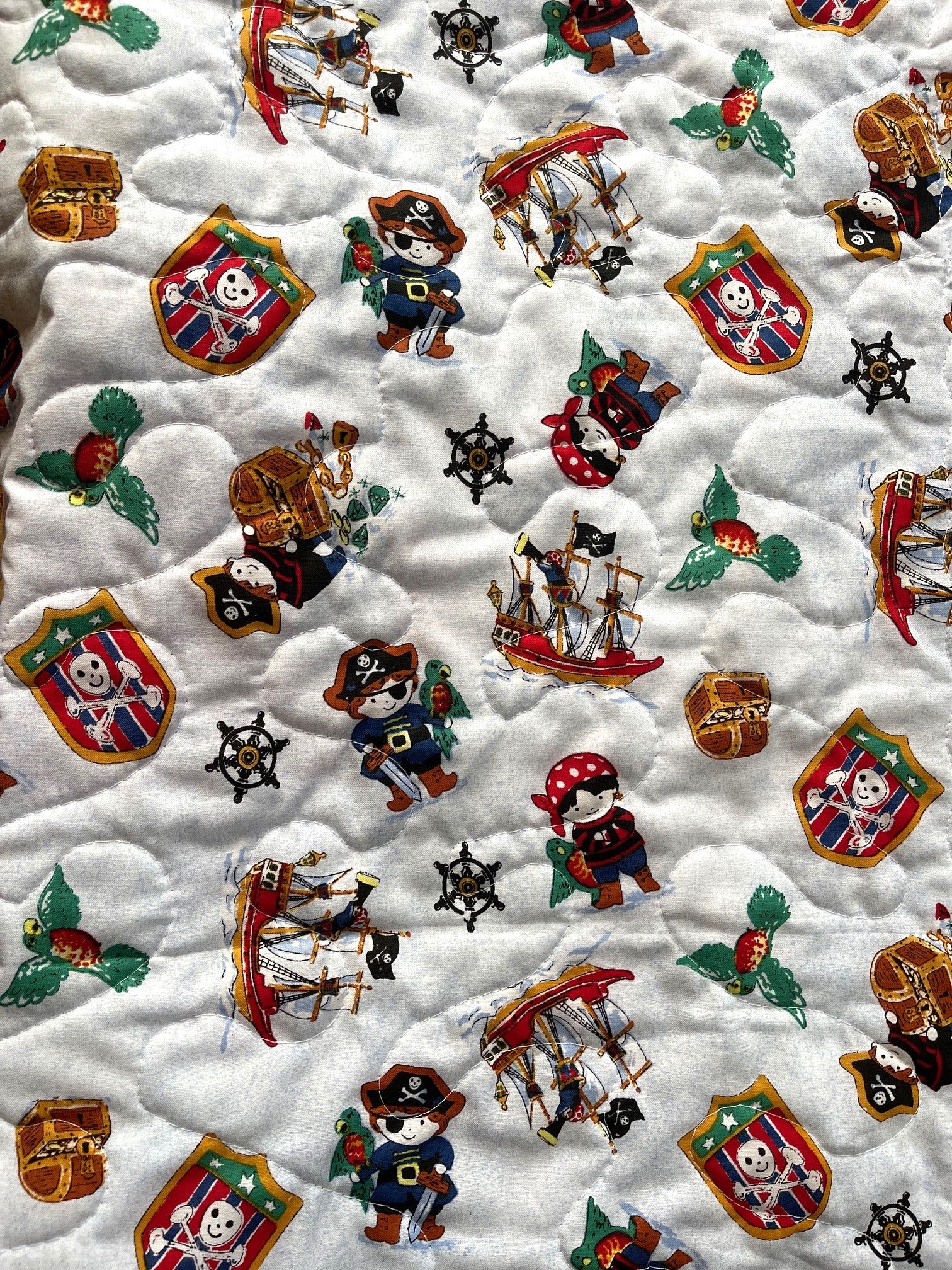 Handmade 100% Cotton quilted blanket includes 3 layers: Top layer is PIRATE TREASURE MAP quilt panel. Centered with quality 100% cotton soft batting. Binding and backing are 100% cotton coordinating fabric with wavy topstitching and mitered corners for a sharp appearance. Stippling Quilted Hand Guided (using Machine) Stippling Quilted for that quilted look when washed.