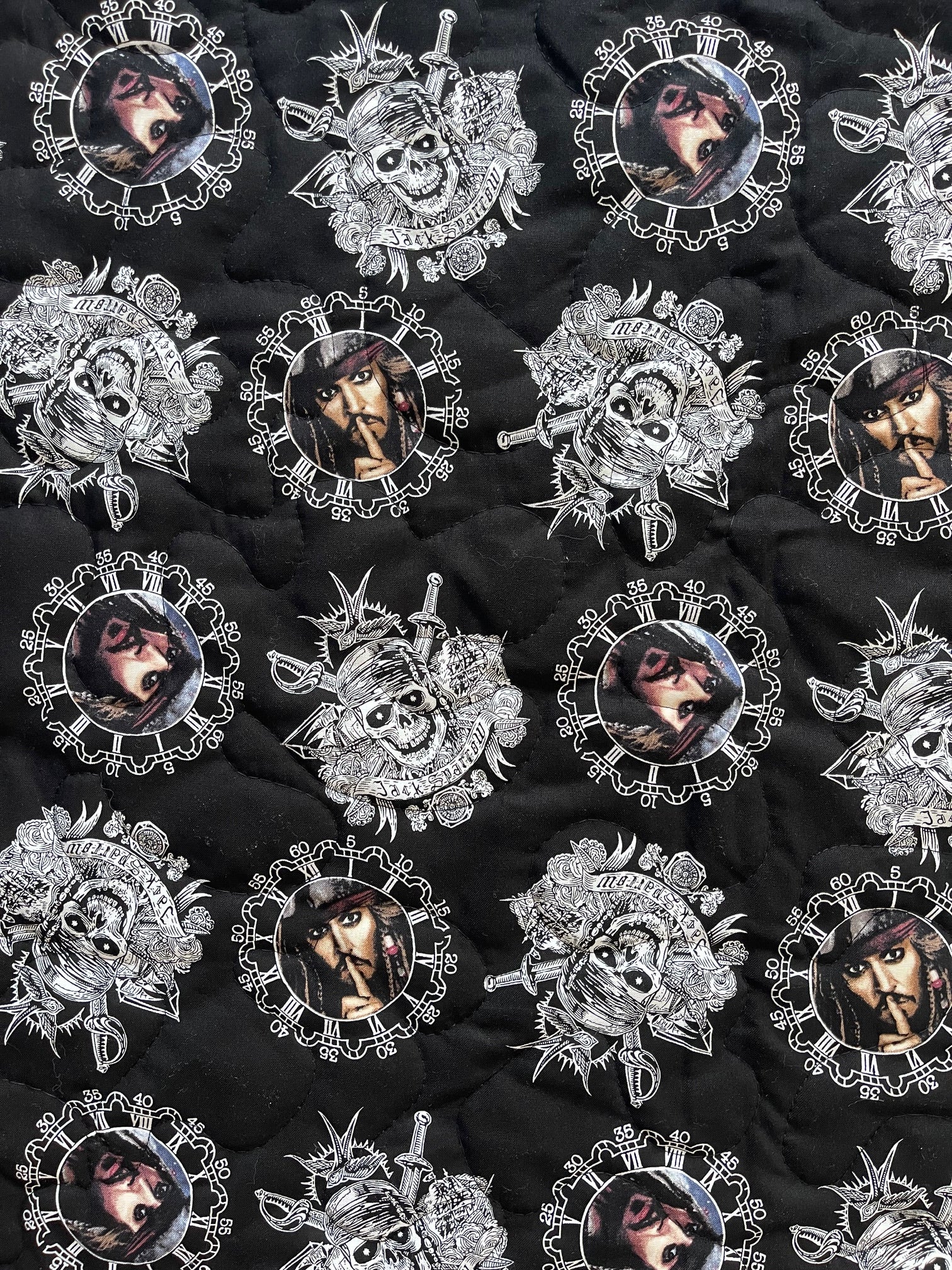 This handmade Gender neutral 100% Cotton lightweight quilted blanket includes 3 layers: Top layer is PIRATES OF THE CARIBBEAN quilt panel. Centered with quality 100% cotton soft batting. Binding and backing are 100% cotton coordinating Jack Sparrow fabric with wavy topstitching and mitered corners for a sharp appearance. Stippling Quilted Hand Guided (using Machine) Stippling Quilted for that quilted look when washed.