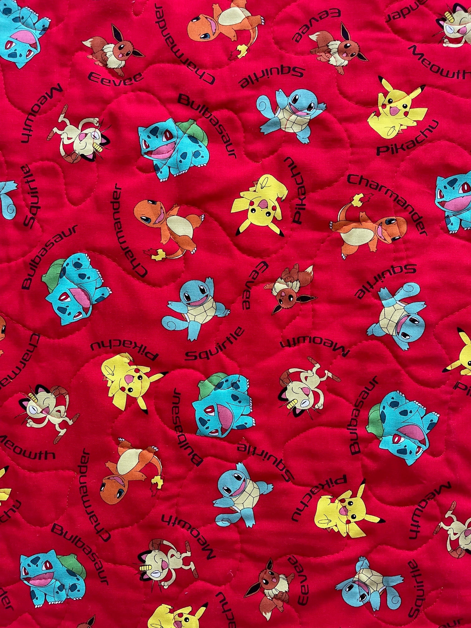 This handmade gender neutral 100% Cotton light weight quilted blanket includes 3 layers: Top layer is Pokémon characters inspired quilt fabric. Centered with quality 100% cotton soft batting. Binding and backing are100% cotton coordinating fabric with wavy topstitching and mitered corners for a sharp appearance. Stippling Quilted Hand Guided (using Machine) Stippling Quilted for that quilted look when washed.