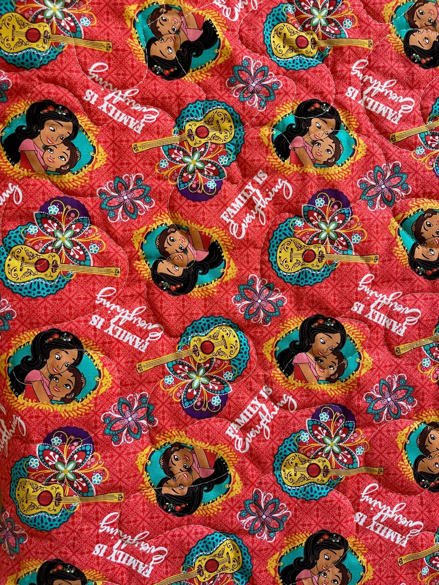 Handmade 100% Cotton light weight quilted blanket includes 3 layers: Top layer is Elena inspired quilt panel. Centered with quality 100% cotton soft batting. Binding and backing are 100% cotton coordinating fabric with wavy topstitching and mitered corners for a sharp appearance. Stippling Quilted Hand Guided (using Machine) Stippling Quilted for that quilted look when washed.