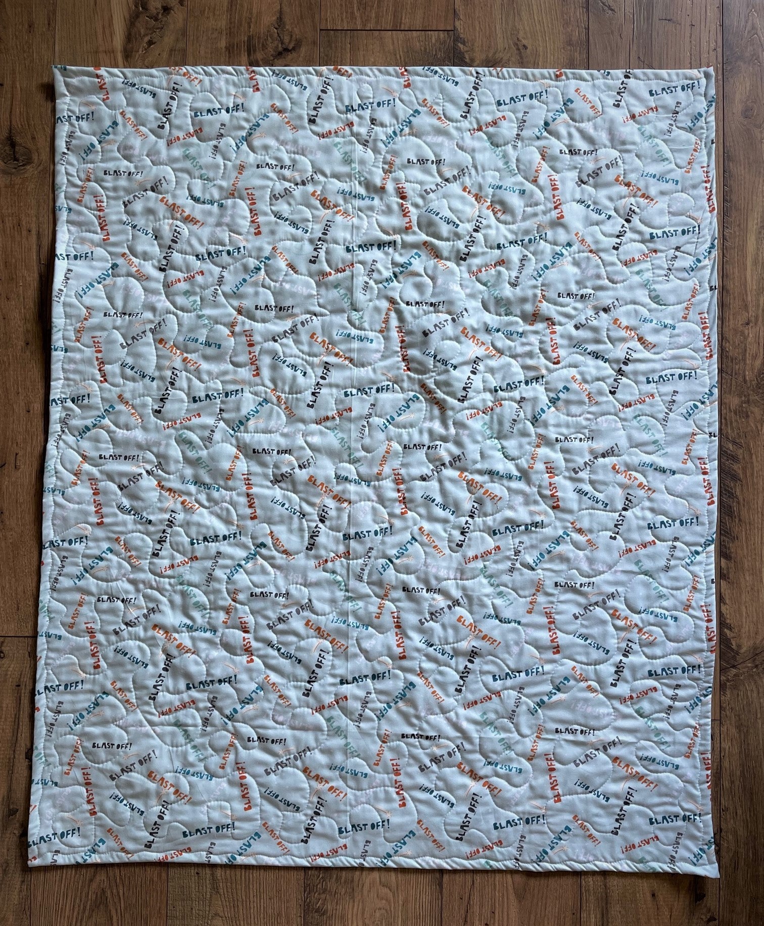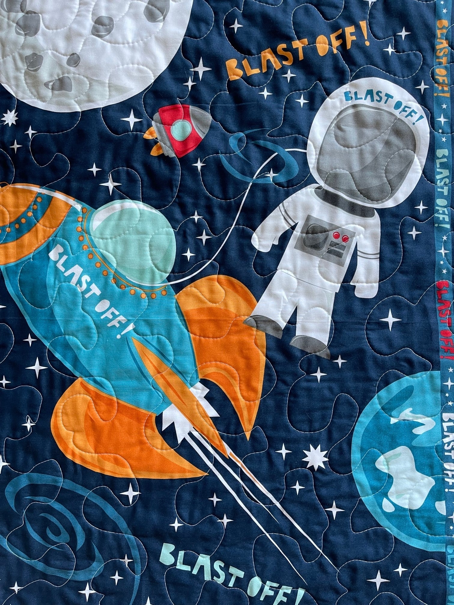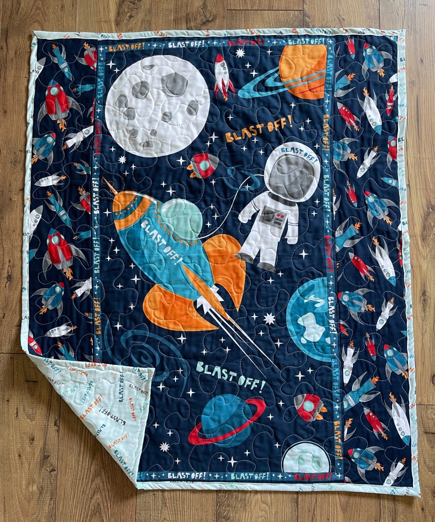 This handmade gender neutral 100% Cotton light weight quilted blanket includes 3 layers: Top layer is Blast off quilt panel and rocket fabric borders. Centered with quality 100% cotton soft batting. Binding and backing are 100% cotton coordinating fabric with wavy topstitching and mitered corners for a sharp appearance. Stippling Quilted Hand Guided (using Machine) Stippling Quilted for that quilted look when washed.