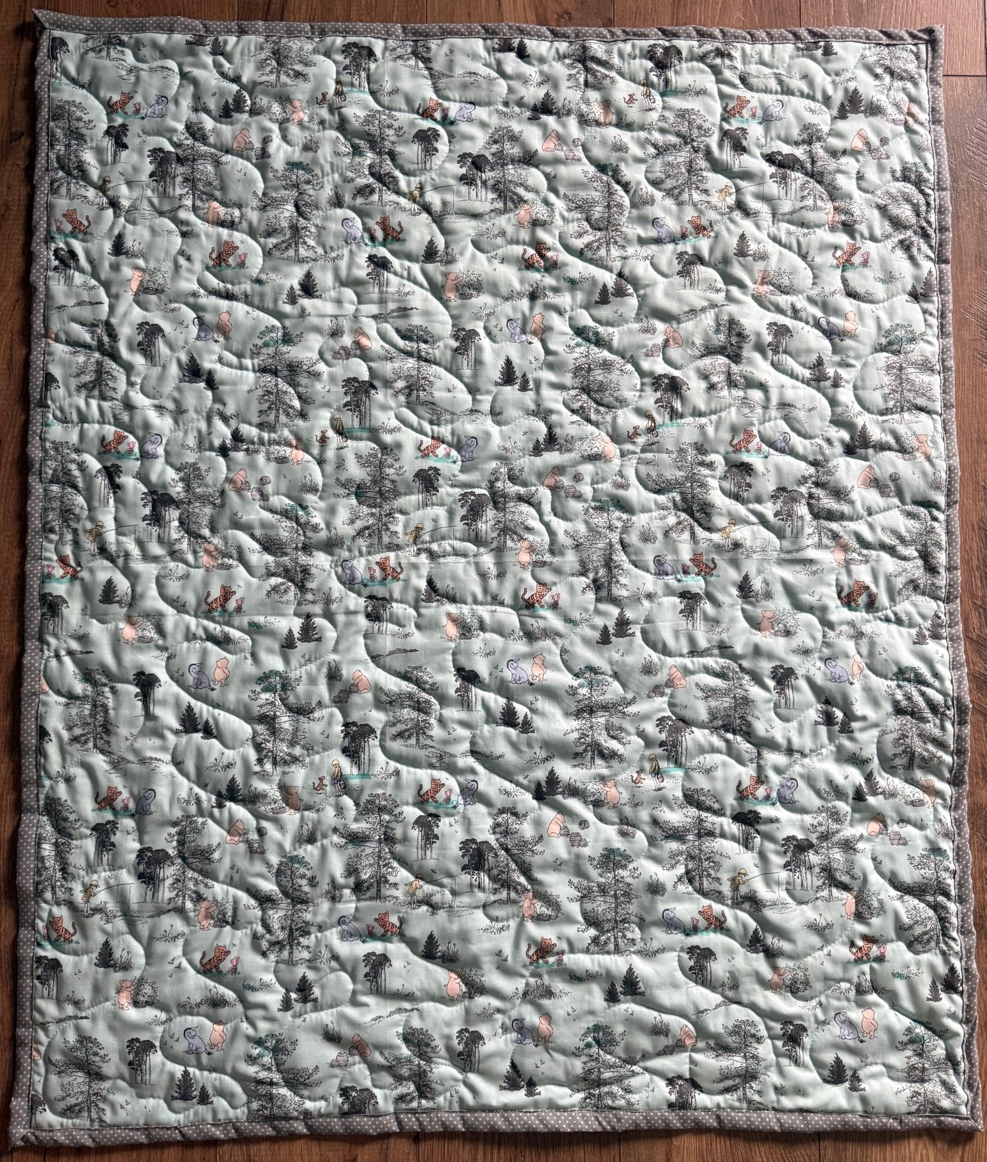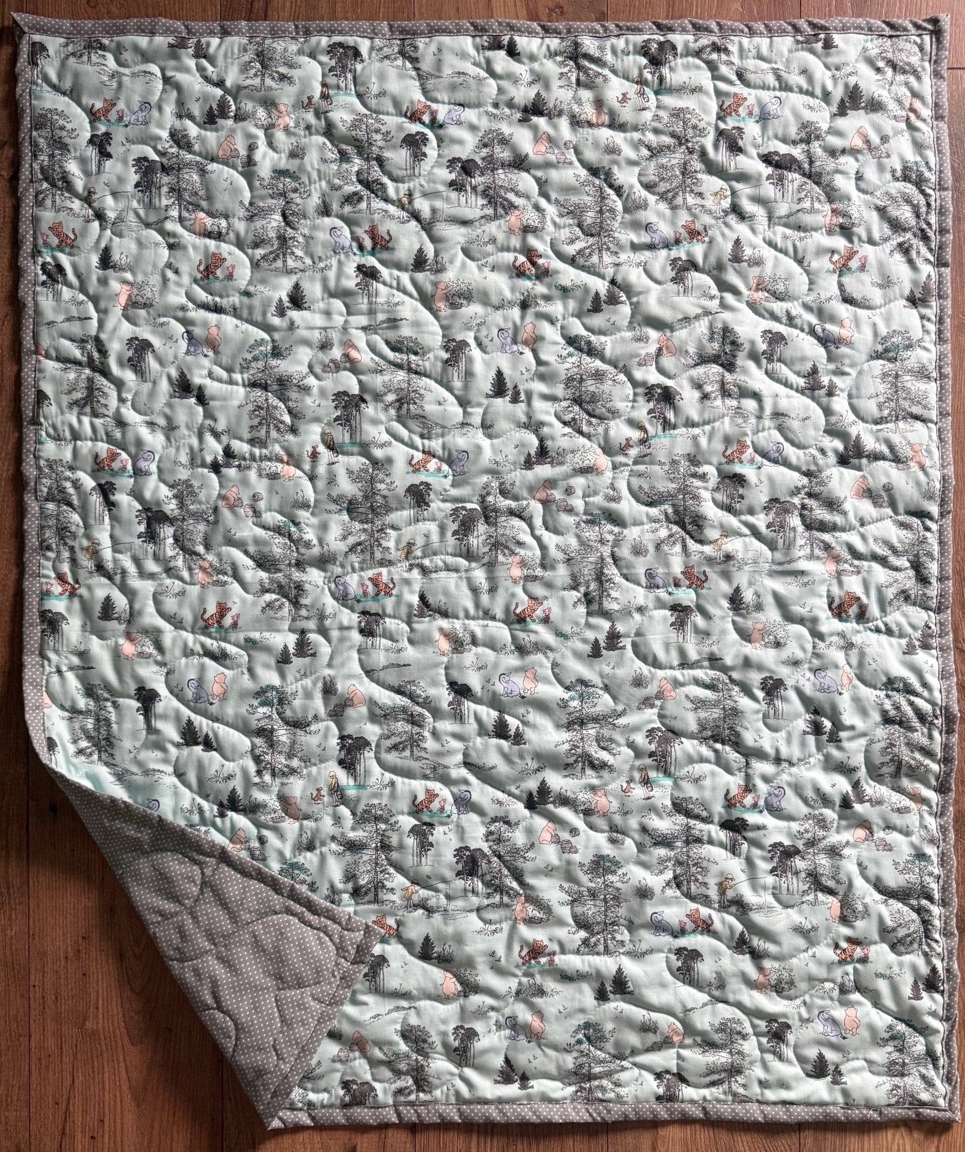 Handmade gender neutral 100% Cotton light weight quilted blanket includes 3 layers: Top layer is WINNIE THE POOH fabric. Centered with quality 100% cotton soft batting. Binding and backing are 100% cotton coordinating gray dot fabric with wavy topstitching and mitered corners for a sharp appearance. Stippling Quilted Hand Guided (using Machine) Stippling Quilted for that quilted look when washed.