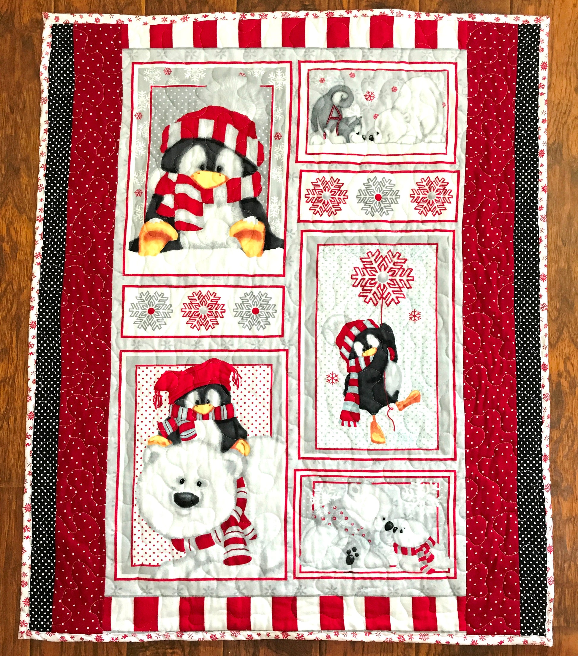 This gender neutral 100% Cotton light weight quilted blanket includes 3 layers: Top layer is Soft Flannel Winter Artic Penguins Polar Bear Friends quilt panel with red white dot and black with white dot fabric borders. Centered with quality 100% cotton soft batting. Binding and backing are 100% cotton coordinating red white snowflake fabric with wavy topstitching and mitered corners for a sharp appearance. Stippling Quilted Hand Guided (using Machine) Stippling Quilted for that quilted look when washed.